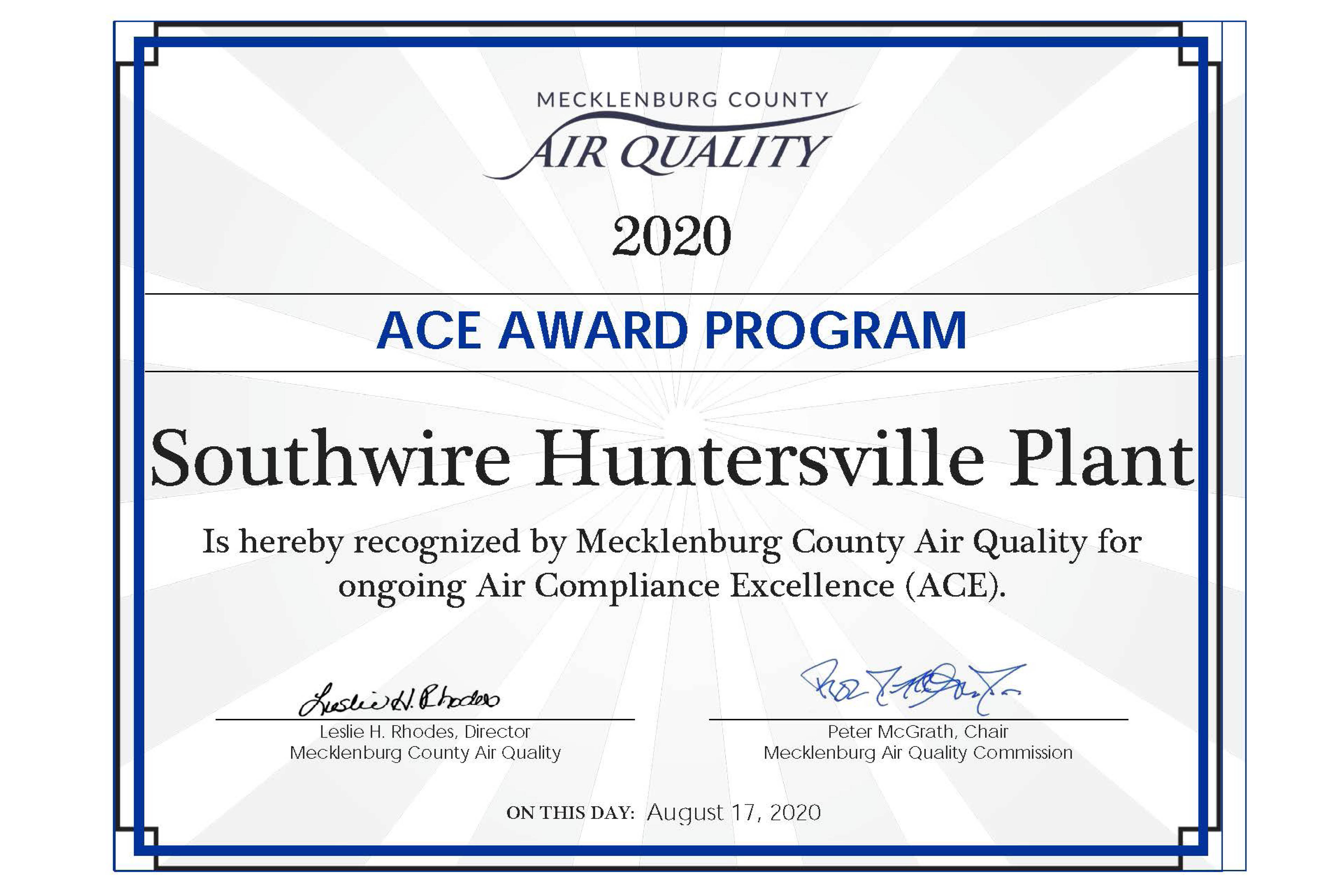 The dedication involved with this commitment aligns with Southwire’s focus on sustainability and the company’s priority to exceed the expectations of our stakeholders, while supporting the wellbeing of our communities and the environment in which we live. By awarding the Huntersville facility the ACE award, the local community is making a public acknowledgment to the plant’s awareness and commitment to improving the air quality in Mecklenburg County.