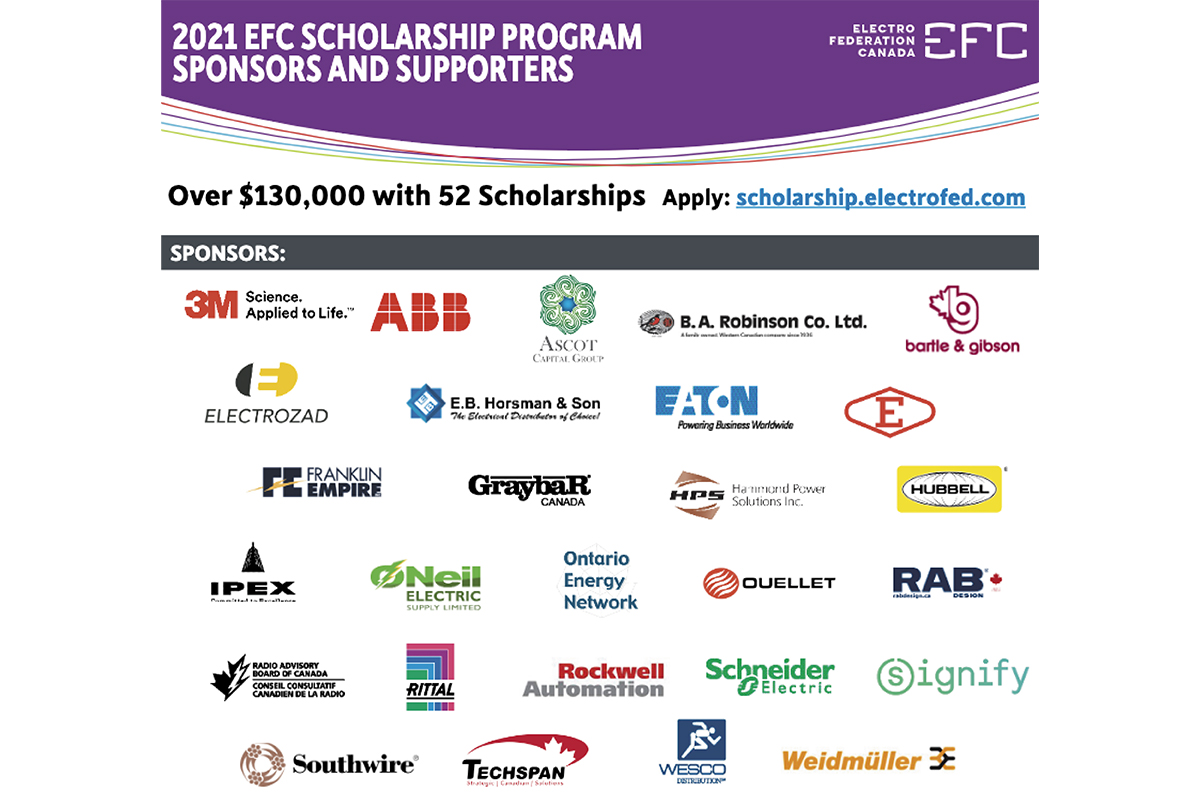 EFC is a national nonprofit industry association in Canada that represents manufacturers, distributors and manufacturing representatives who sell a wide range of electrical products, contributing more than $10 billion to the Canadian economy. EFC empowers the industry with market intelligence, professional development and acts as a voice for advocacy and standards advancement within a safe, collaborative environment. The organization and its members are proud to support the next generation of leaders who will power a changing world in the Canadian electrical industry through their annual Scholarship Program.